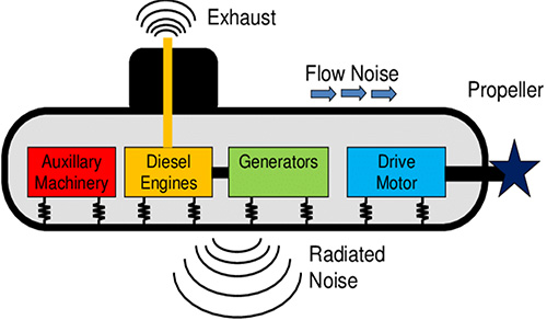 수중방사소음은 함정에 탑재된 장비 소음이 선체 외판을 투과한 소음(ABN, Air-Borne Noise), 장비 작동 시 발생하는 진동이 선체 외판으로 전달되어 발생하는 소음(SBN, Structure-Borne Noise), 프로펠러에 의해 발생하는 소음(WBN, Water-Borne Noise)으로 구성된다. 수중방사소음은 이러한 소음들이 음파 전달경로를 통해 수중으로 방사되는 소음을 말하며, 적 SONAR 등의 탐지 수단에 의하여 피탐 여부를 결정하는 중요한 요소로 함이 은밀성을 유지하고 작전을 성공적으로 수행하기 위해서는 낮은 소음수준을 유지해야 한다.