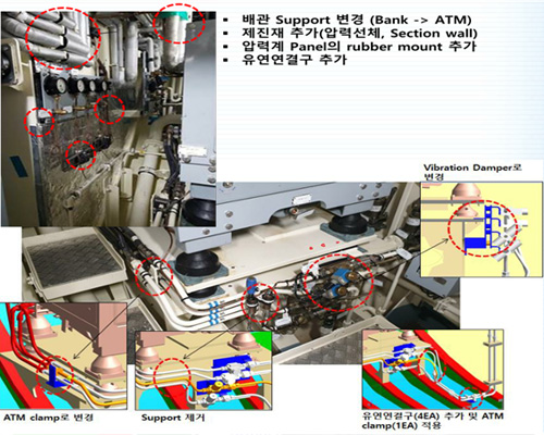 양산단계에서 보다 더 많은 소음 저감을 위해 추가적인 개선방안을 도출하여 적용하였다. 고압냉각해수 배관 및 재생식이산화탄소 제거장치 배관 계통의 구조 변경을 통해 추가적인 수중방사소음 저감을 달성하였으며 세부내용은 아래와 같다.