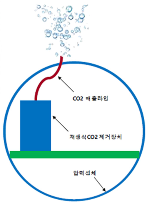 둘째, 재생식 이산화탄소제거장치의 CO2 를 고압냉각해수 배관을 통해 배출하도록 구조를 개선하였다. 함 외부로 연결된 고압해수라인으로 CO2를 배출하고 미세버블생성기를 추가로 적용하여 배출 시 발생하는 기포의 크기를 최소화하였다.