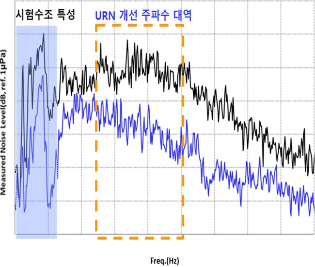 수중방사소음 저감 방안 효과성 사전 검토를 위해 배출소음을 음향 수조에서 함정 건조업체(한화오션) 주관으로 측정하였으며, 확인결과 체계개발 단계 대비 저감된 것이 정량적으로 확인되었다.