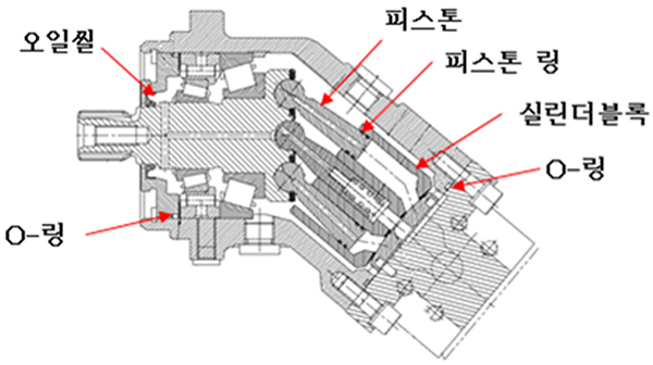 동력장치 유압펌프는 그림 4와 같이 피스톤, 실린더 블록, 피스톤 링, 오일씰, O-링 등으로 구성되는데 이러한 구성품들이 노후화되면 내부 누유가 발생하게 되고 펌프 효율 저하로 이어진다. 또한, 구동계에서 외부 충격 등으로 인한 링크간의 마모와 유격으로 구동력 저하가 발생할 수 있다. 그림 5는 파도막이 구동장치 구성도를 나타내었다.