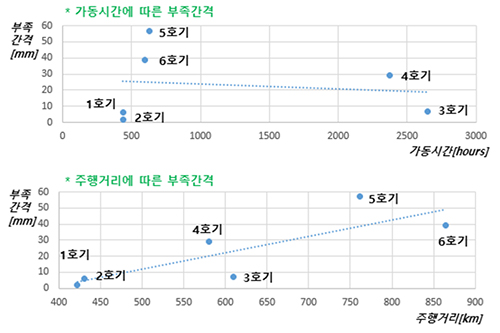 가동시간에 대한 파도막이 전개 부족 간격 결과에서는 경향성이 확인되지 않았다. 따라서 가동시간에 따른 영향은 낮은 것으로 판단된다. 하지만 주행거리에 따른 파도막이 전개 부족 간격 결과에서는 경향성이 확인되었다. 주행거리가 길수록 파도막이 전개 부족 간격이 증가하는 것으로 보아, 누적 주행거리가 파도막이 구동장치 노후화에 영향을 미친 것으로 판단된다.