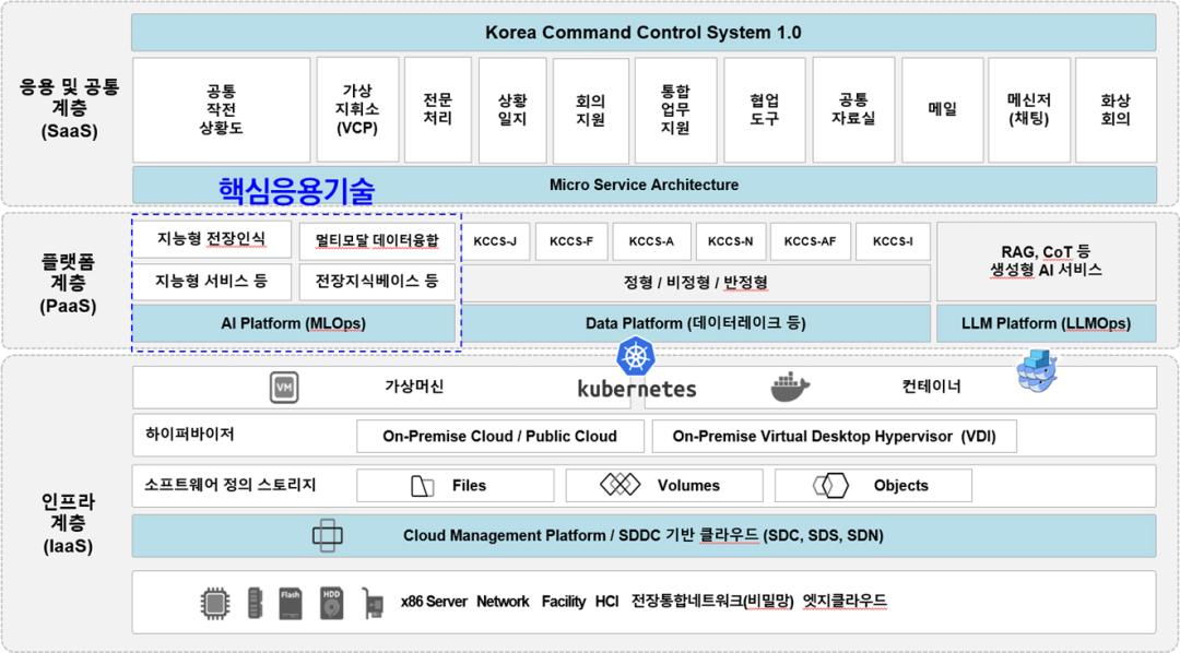 플랫폼계층(PaaS)는 인공지능서비스를 위한 AI플랫폼, 데이터를 통합하고 분석하는 데이터플랫폼, 생성형AI서비스를 수행하는 LLM 플랫폼으로 크게 나눌 수 있다. 인공지능 서비스는 KCCS 체계가 갖춰야 할 서비스 기능으로 지금도 각 분야에서 활발히 연구되는 것처럼, 지속적으로 논의되고 발굴되어야 한다.