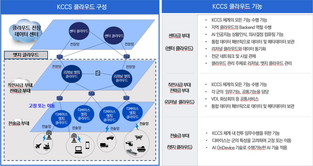 KCCS 체계의 클라우드는 센터, 부대 클라우드로 구분될 수 있다. 부대는 역할에 따라서, 리저널(지역) 클라우드, 엣지 클라우드로 세분화 할 수 있다. 엣지 클라우드는 센서와 사용자를 연결하고, 리저널 클라우드에서는 각 군의 핵심 기능 및 VDI, 공통서비스 등의 기능을 수행하여야 하며, 센터 클라우드는 리저널과 엣지클라우드의 응용서비스를 보완하고 거대한 연산이 필요한 인공지능 서비스를 수행한다.