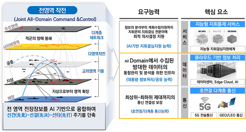 미래의 전쟁은 지상, 해상, 공중, 사이버, 우주의 5대 영역으로 구분하고, 다계층 네트워크 기반하에 다영역작전(Multi Domain Operation)를 수행한다. 초연결 다계층 통신을 통해 엣지의 센서정보부터 슈터까지 통합하기 위해 클라우드와 인공지능 기술을 적용하여, AI기반의 지휘결심지원 능력을 향상시키고, AI지휘참모기능을 개발하여 신속하고 효율적인 작전을 지원한다.