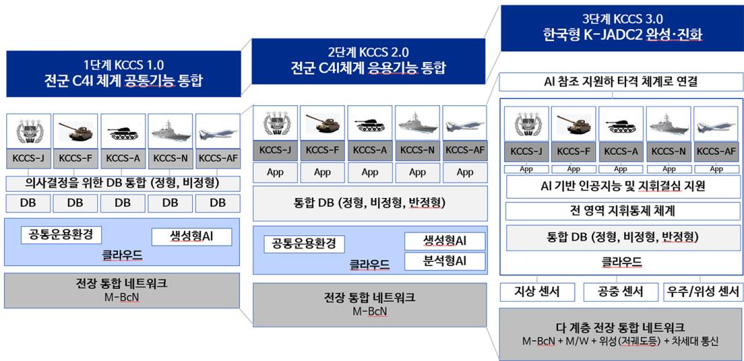 합동참보본부는 추세에 맞춰 발빠르게 한국형 합동전영역지휘통제체계(K-JADC2) 전략을 수립하고, 성공적인 전력추진을 위해 운용개념, 핵심기술, 최신기술, 규정 등에 대해서 준비해 나가고 있다. K-JADC2의 핵심적인 역할은 지휘통제정보공유체계(KCCS)이다. 지휘통제정보공유체계(KCCS)는 전 영역의 통합작전을 수행하기 위해 각 군이 현재 운용하고 있는 합동지휘통제체계(KJCCS), 전구합동화력운용체계(JFOS-K), 육군전술지휘통보체계(ATCIS), 해군전술지휘정보체계(KNCCS), 공군전술지휘정보체계(AFCCS) 의 통합된 지휘통제체계이다. KCCS체계 통합이 추진되면, 각 군의 C4I 명칭도 KCCS-J, KCCS-F 등의 명칭으로 변경하는 것으로 계획하고 있다. 이러한 성공적인 K-JADC2를 위한 계획은 체계적이고 단계별로 추진되어야 한다. 합참은 3단계로 추진전략을 구분하고 이에 대한 청사진을 제시하고 있다.
