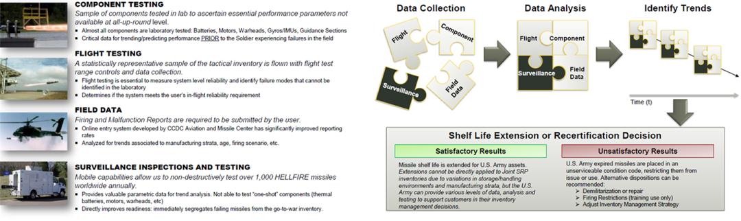또한, DA PAM 702-16은 저장시험(Storage Test), 기능시험(Function Test), 환경시험(Environmental Test), 비파괴검사(Nondestructive Test) 등 구체적 시험평가 절차를 규정하고 있으며, 그 핵심은 통계학적 접근에 있다. 제한된 샘플 기반으로 전체 재고의 신뢰성을 추정하기 위해 베이지안(Bayesian) 분석과 와이블(Weibull) 분포와 같은 통계 기법을 적용하여, 탄약의 전체 고장 확률을 추정한다. 그리고 DA PAM 742-1은 탄약의 저장·수송·배치 전 과정에서 수행되어야 할 점검 절차를 제시함으로써, 유도탄 ASRP를 단순 시험실 차원의 절차가 아닌 실제 운용 현장과 연결된 관리 체계로 확장시켰다. 예컨대, 특정 기후 조건(고온다습, 한랭건조 등)에 따라 탄약의 열화 양상이 상이하므로, 지역별 저장 환경에 적합한 맞춤형 감시 기준이 필요하다. DA PAM 742-1은 이러한 환경 차이를 반영한 관리 지침을 제공하고 있다.