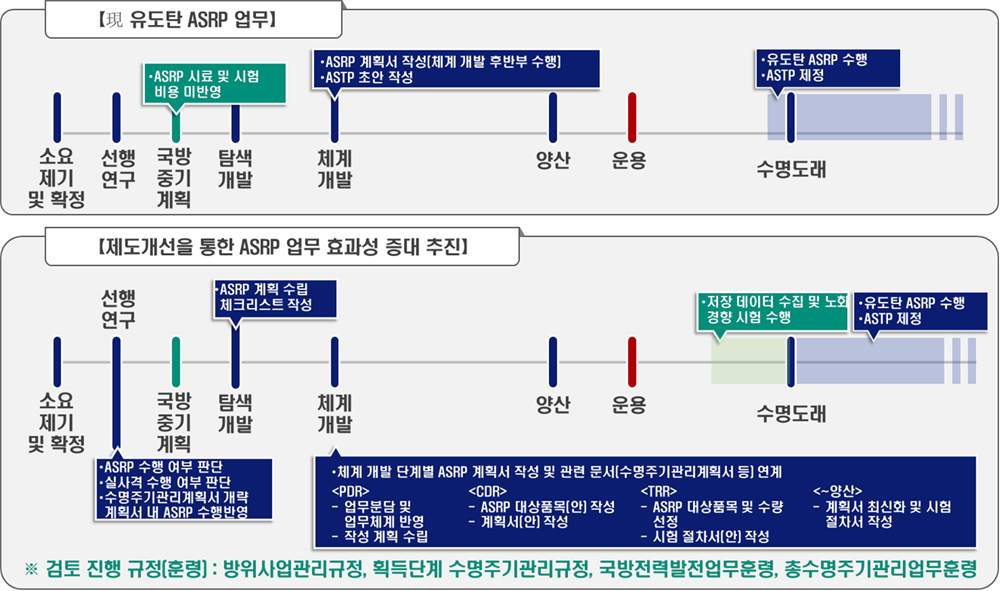 또한 유도탄 ASRP는 양산 후 10여 년이 경과한 시점부터 시행되기 때문에, 개발 단계에서 계획이 수립되더라도 ‘권고’ 수준에 그치는 경우가 있다. 그 결과, 체계적이고 실효성 있는 계획 이행에 다소 어려움이 있으며, 임무와 역할도 분산되어 있어 의사결정도 일부 제한되는 문제점을 갖고 있다.