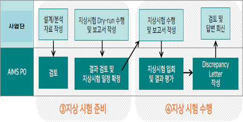 다음은 ③지상시험 준비 단계이다. AIMS PO에게 입회 요청하기 전 사전 테스트하는 절차로 이 단계를 Dry-run이라고 부르며, AIMS PO에서 정한 지상시험 요구도 충족 여부를 확인한다. 해당 시험 결과는 AIMS PO로 제출되고 AIMS PO에서 검토 후, 특이사항이 없을 시 다음 단계로 넘어간다. ④ AIMS PO 입회 하에 응답기 지상시험을 수행한다. 시험 결과 불일치 사항 또는 결함이 생기면 AIMS PO는 Discrepancy Letter를 작성하여 해당국에 수정을 요청하며 해소 시, 다음 단계로 넘어간다. 다음 그림은 절차 ③, ④에 대한 주최별 역할을 나타내었다.