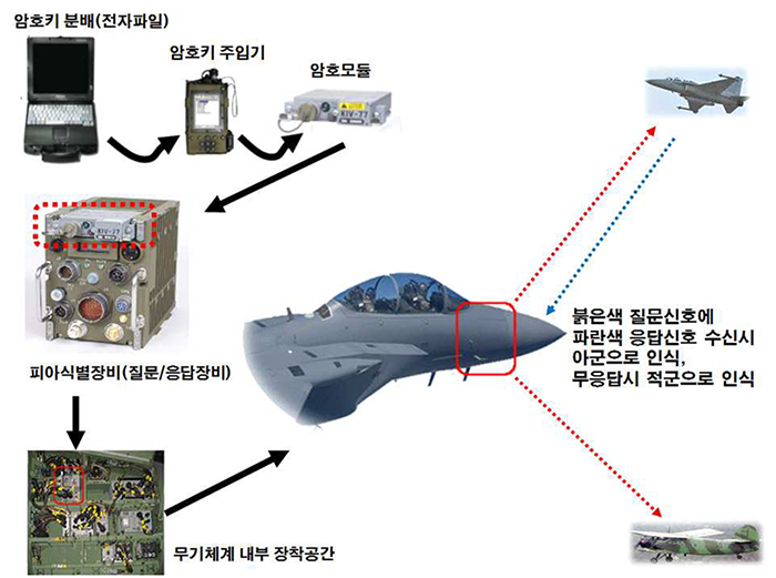 피아식별의 과정은 다음과 같다. 먼저 질문기와 응답기 간 상호 주파수 일치 여부를 확인한다. 일치할 경우, 미확인 항공기로 인지한 후 다음 단계로 넘어가고, 주파수가 불일치할 경우 적으로 간주된다. 다음 단계는 IFF MODE 동일 여부를 확인한다. 동일할 경우, 다음 단계로 넘어가고, 동일하지 않을 때는 적기로 분류된다. 마지막 단계는 암호화 MODE 확인 단계이다. 질문기에서 송출하는 연속적인 식별코드를 응답기에 장착된 암호조립체에서 변조하여 송출한 신호가 일치하면 아군으로 판명된다. 이때 암호키는 전자파일의 형태로 암호키 주입기에 의해 암호조립체에 사전에 장입된다. 이 단계에서 잘못된 답이라고 판명될 경우, 허위 표적으로 간주하여 적으로 분류될 가능성이 높다. 다음 그림은 암호키 장입부터 적아를 판단하는 과정을 도식화한 것이다.
