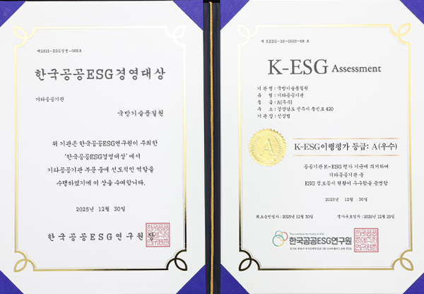 국방기술품질원(원장 신상범)은 12월 30일 오전 국회의원회관 제2소회의실에서 한국공공ESG연구원 주최·이소영의원실 주관으로 열린 「제3회 한국공공ESG경영대상」 시상식에서 K-ESG 이행평가 부문 ‘대상’을 수상했습니다.