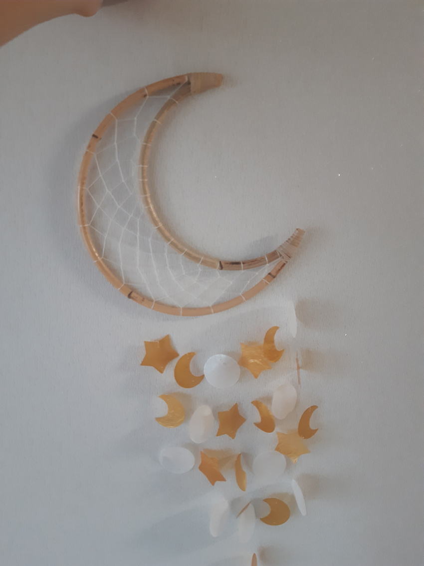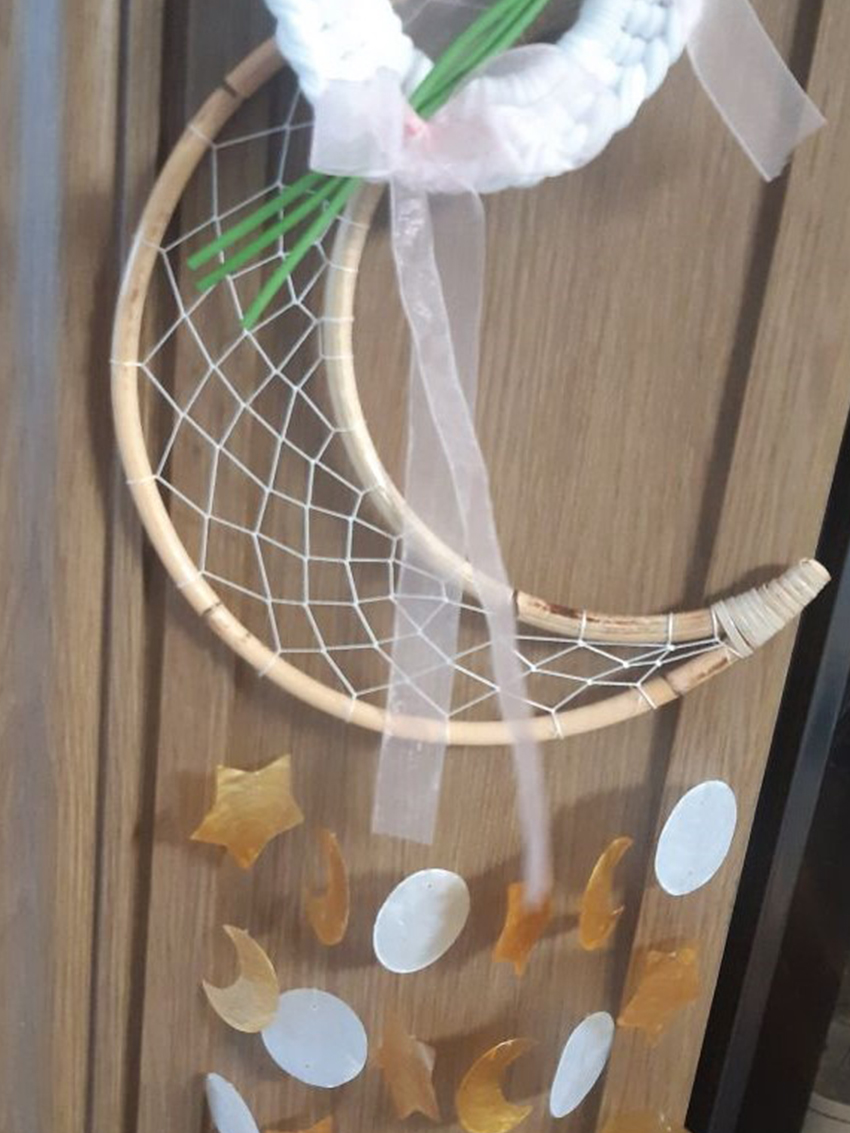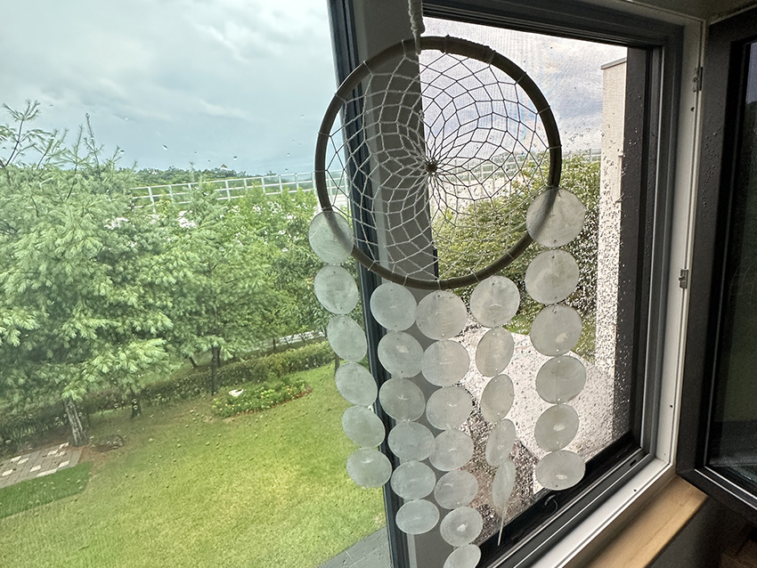 완성품은 최종적으로 최근에 악몽을 몇 번 꾼 둘째 아들 침대 옆에 걸어두었다. “이제 악몽은 꾸지 않을 거야~ 드림캐처가 우리 민준이를 지켜줄 거니 믿어보자”라고 둘째에게 이야기해두었다. 걸어둔 위치가 창문 옆이라서 바람이 불면 자개 장식이 부딪히는 소리가 기분 좋게 들렸다. 숙면을 도와주는 백색소음 같은 효과도 있는 것 같다. 정말 드림캐처의 효과 덕분인지, 현재까지 둘째 아들은 악몽 없이 무탈한 밤을 보내고 있다.