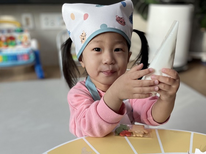 거실로 나가보니, 언제 샀는지 앞치마와 조리모까지 착용한 딸이 테이블 옆에 앉아있었습니다. 체험 키트 박스를 개봉하자마자, 시작도 하기 전에 쿠키 조각들을 입으로 가지고 가는 아이의 손을 만류해야 했습니다.