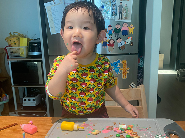 본격적인 집 만들기가 시작됐는데요. 어른에게는 너무나도 간단한 작업이었지만 아직 손으로 하는 미세한 작업이 서툰 아이에게는 난도가 높았습니다. 아이싱 크림을 바르는 작업은 아이의 손을 잡고 함께 했고, 집을 이쁘게 만들어줄 꽃, 별, 동그라미 모양의 쿠키는 아이가 직접 붙였습니다. 그 과정에서 아이는 혼자 하겠다며 고집도 부리고, 잘 안된다고 짜증을 내기도 했지만, 다행히 남는 쿠키 조각들이 많아 입에 넣어주며 열심히 비위(?)를 맞춰드렸습니다.