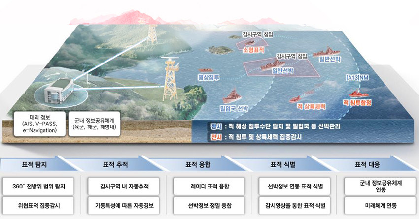 미래의 해안감시 시스템은 AI 기술과의 융합을 통해 자동화된 감시 체계로 발전하고 있다. 이미 우리 군에서도 레이더와 열상감시장비(TOD) 폐쇄회로(CC) 텔레비전(TV) 해안감시장비와 연동된 AI가 자동으로 의심 선박을 탐지·식별·경고·추적·자동표적 인계까지 수행할 수 있는 체계가 구축되고 있다.