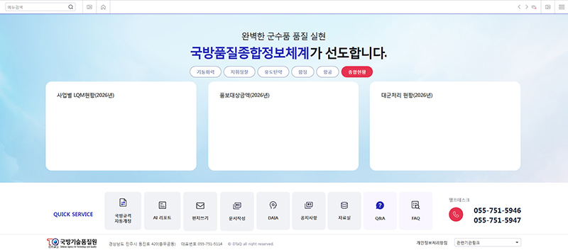 사업을 통해 구축된 국방품질종합정보체계는 군수품의 개발·양산·운영 단계에서 생성되는 품질정보를 수집하고 관리하는 데이터 기반 품질관리 시스템으로, 양질의 품질정보 서비스를 제공하고 데이터 기반의 과학적 품질관리를 지원하기 위해 구축됐다.