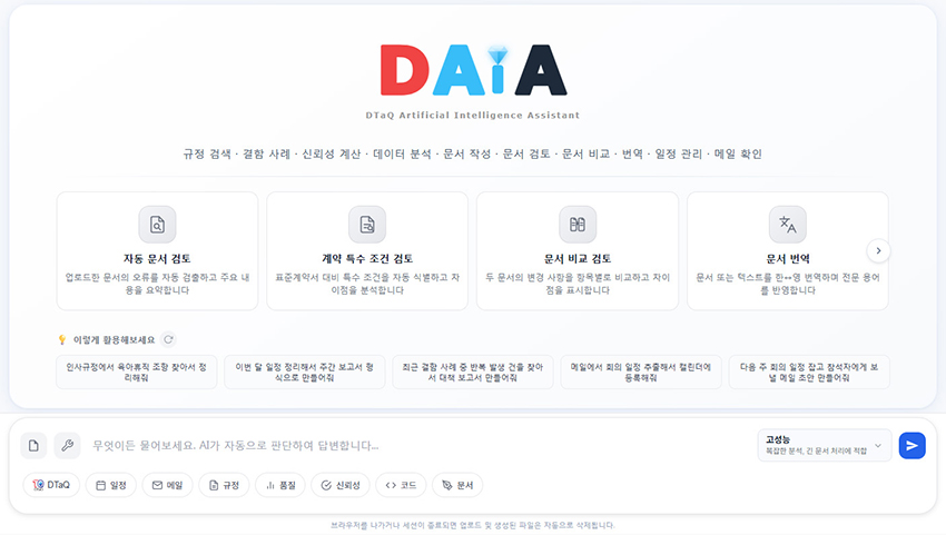 품질관리 업무에서는 규정을 찾거나 문서를 검토하고 데이터를 분석하는 작업이 반복적으로 이루어집니다. 이러한 업무는 중요하지만 시간이 많이 소요되기도 합니다. DAIA는 이러한 업무를 지원해 직원들이 보다 중요한 분석이나 의사결정 업무에 집중할 수 있도록 돕기 위해 도입되었습니다.