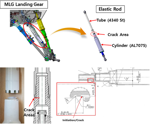 결함은 MLG(Main Landing Gear) 구조물 중 Elastic Rod 내의 스프링 링크에서 균열이 발생하였다. Elastic Rod는 특수 스프링 로드와 몇 개의 소형 링크로 구성되어 행정(Stroking)시에 휠축을 고정하여 MLG실 내에 타이어를 정확하게 위치시키는 역할을 하며, 상세 결함 부위는 아래 그림 1과 같다.