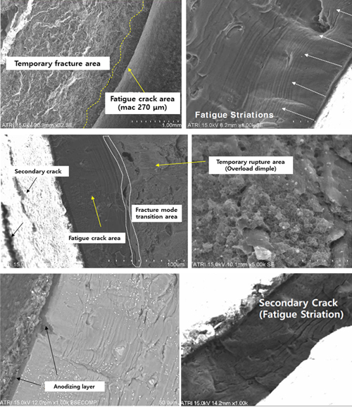 그림 2의 Elastic Rod 실린더 파단부위에 대한 분석 결과 피로균열은 Tube 원주 외부에서 내부로 진전되었으며, 전체 원주 길이 대비 약 80%에서 다중시작점으로 시작됨을 그림 3과 같이 확인하였다.