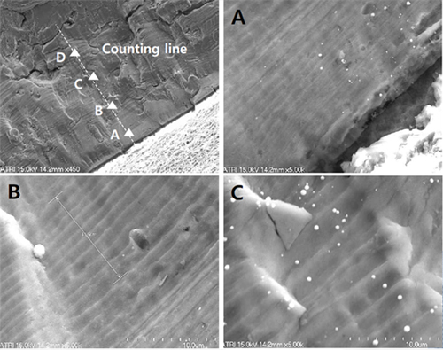피로균열 발생부위 최대 깊이는 약 270 μm이며, 뚜렷한 피로줄무늬(Striation)가 시작 부위부터 관찰되는 등 다수의 Origin이 시작되는 특징을 고려한다면 비교적 높은 하중이 작용한 것으로 추정된다[2]. Dimple 방향(등축)의 일시파단 영역은 피로균열 진전(최대 0.3 mm) 중에 발생된 비정상적인 수직방향의 인장하중에 의한 것으로 보인다. 피로줄무늬 밀도(striation density) 분석결과, 전형적인 LCF(Low Cycle Fatigue) 현상이 관찰되었으며, 그림 4와 같이 Counting line 분석결과 500~600개로 계산되었다[3].