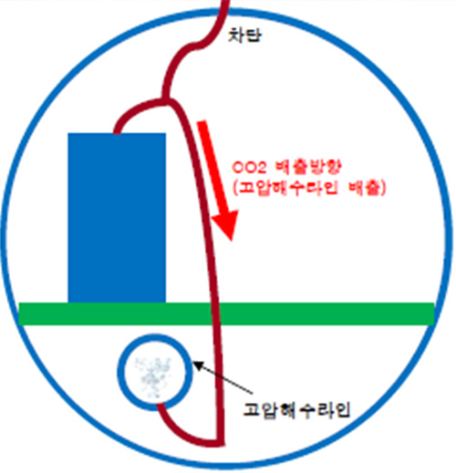 둘째, 재생식 이산화탄소제거장치의 CO2 를 고압냉각해수 배관을 통해 배출하도록 구조를 개선하였다. 함 외부로 연결된 고압해수라인으로 CO2를 배출하고 미세버블생성기를 추가로 적용하여 배출 시 발생하는 기포의 크기를 최소화하였다.