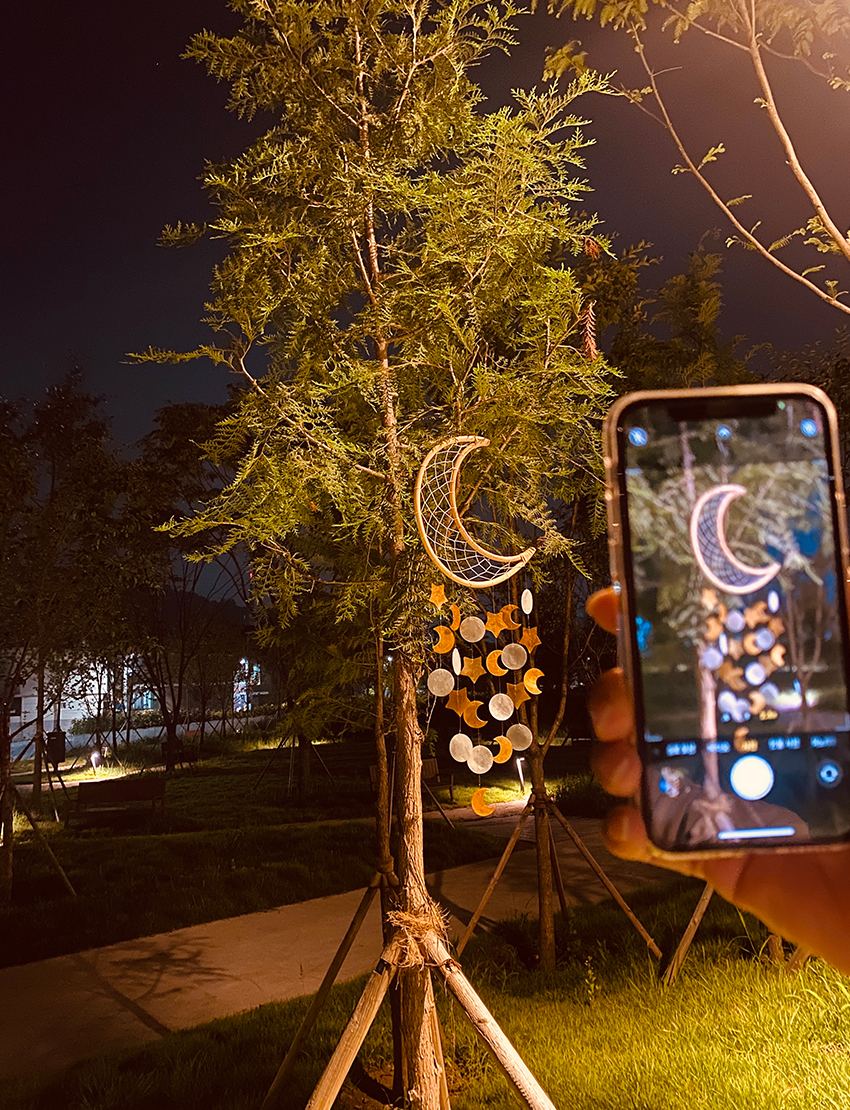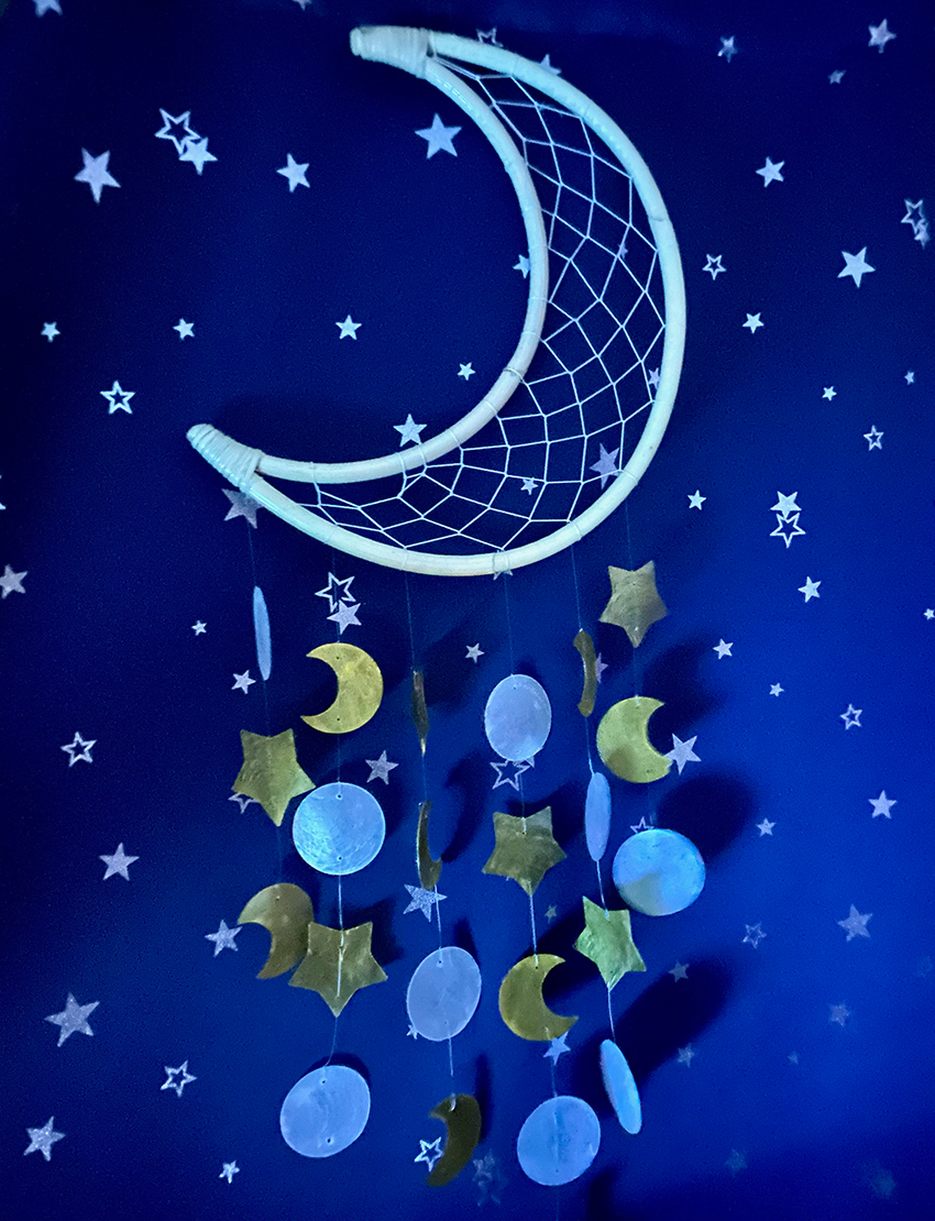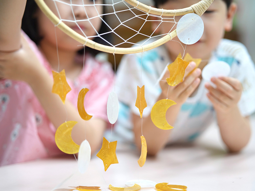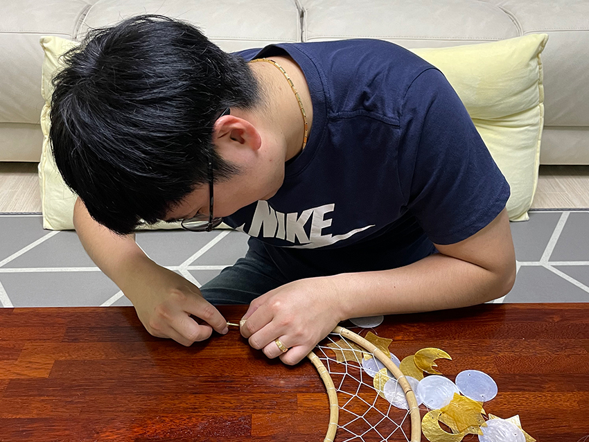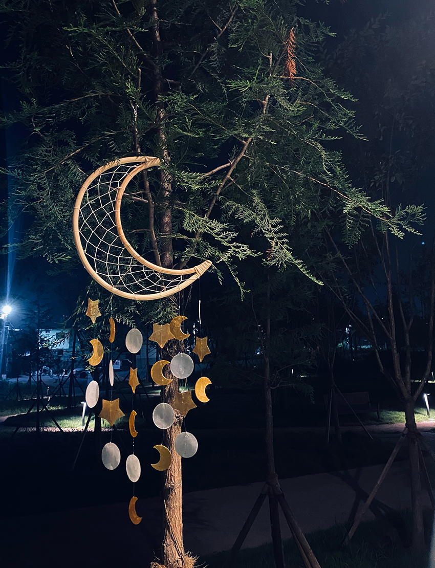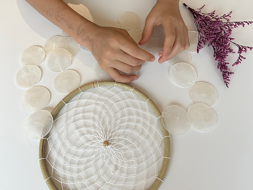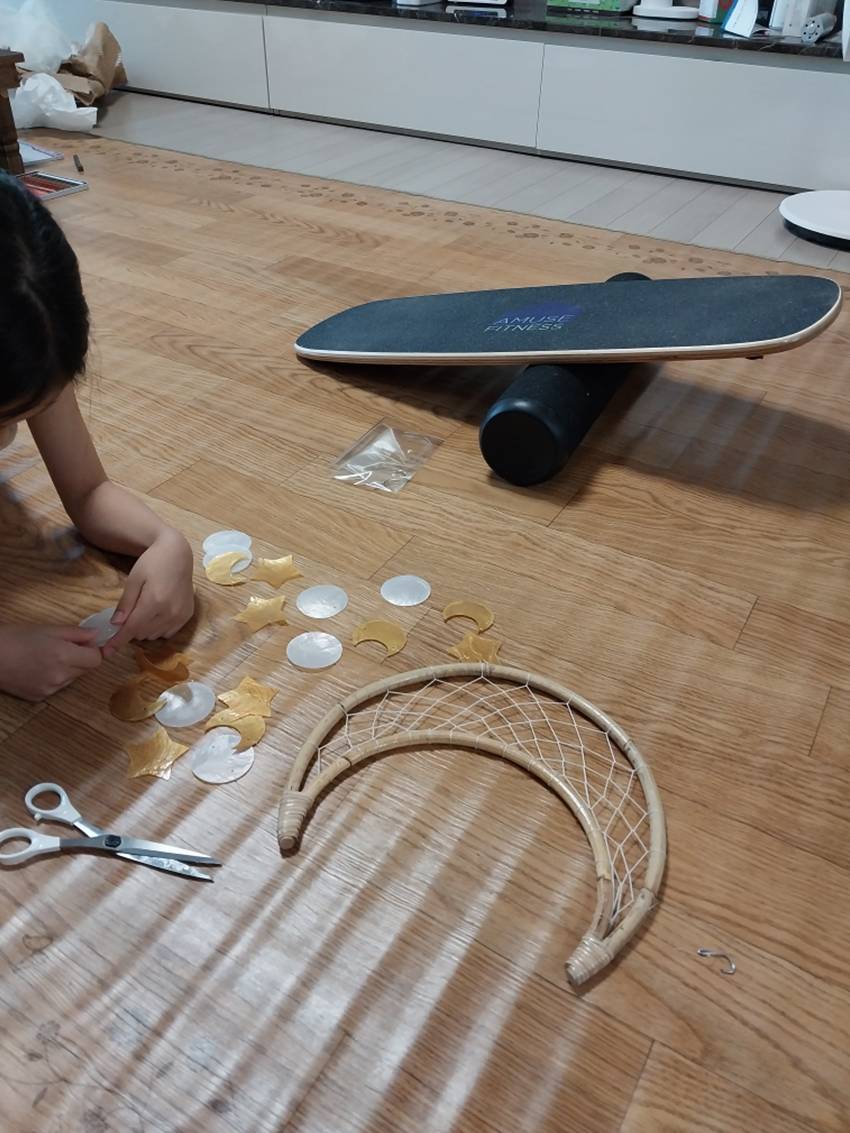 체험 키트 포장을 뜯자 그물망으로 만들어진 초승달 모양의 틀과 줄에 엮어진 자개 묶음이 보였다. 옛날 인디언들은 드림캐처의 그물망이 좋지 않은 꿈을 걸러준다고 믿었다고 한다. 자개를 꺼내자 총총거리는 상쾌한 울림소리가 들렸다. 여름밤의 끈적거림이 정말로 해소될까? 하는 기대가 생겼다.