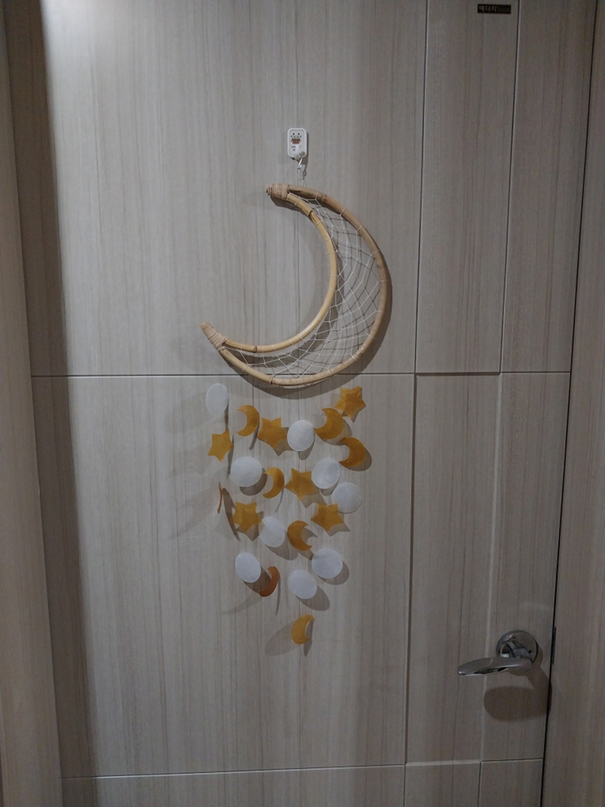 다 끝난 후 큰 아이는 자신이 만든 풍경이 따로 있다며, 부럽지 않다고 말을 했다. 하지만 내심 샘이 나는 모양이다. 둘째는 예상대로 흡족해했다. 드림캐처는 아이들 방문 앞에 걸어주었다. 구석진 곳에 아이들 방이 있는데, 이것 때문인지 굉장히 밝아 보인다. 문을 여닫을 때마다 청명한 소리가 울려 퍼졌다.