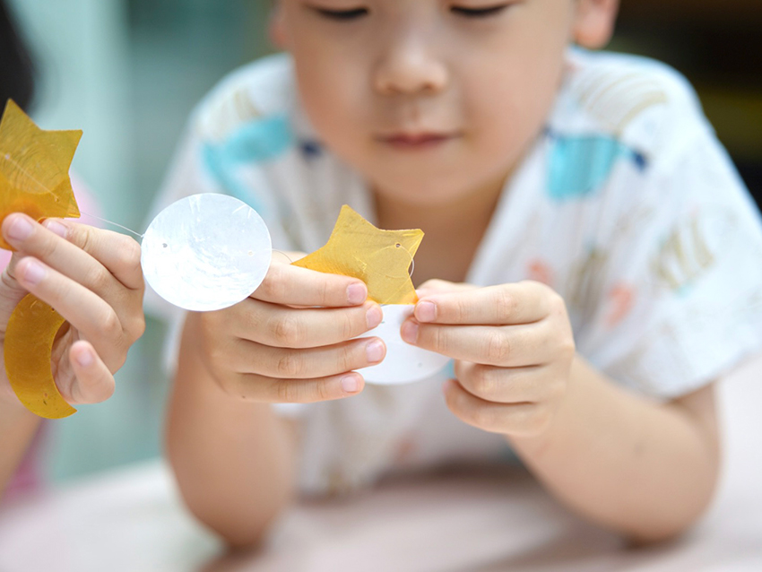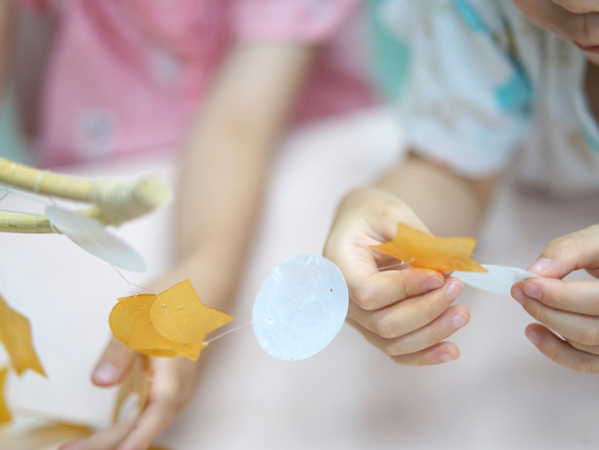 다행히 크게 손을 댈 필요가 없는 상태로 체험 키트가 배송되었다. 아이들이 할 일은 줄을 잘라서 묶고, 고리를 달고, 간격을 조절하는 것. 본격적인 작업에 들어가자 어른이 보기에 5분이면 족한데 아이들은 30분이 넘도록 가지고 놀고 있다. 줄을 달다가 자개를 흔들고, 또 고리를 달다가 다시 자개를 가지고 소리를 들어본다. 그 시간 동안 집안 곳곳에 경쾌한 소리가 울려 퍼졌다.