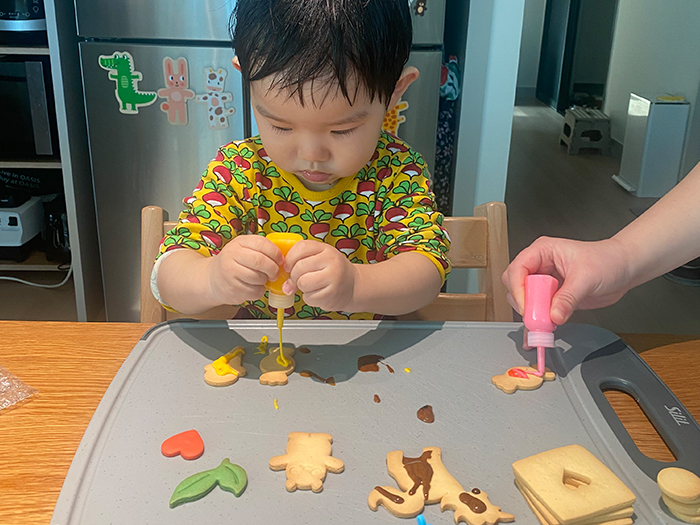본격적인 집 만들기가 시작됐는데요. 어른에게는 너무나도 간단한 작업이었지만 아직 손으로 하는 미세한 작업이 서툰 아이에게는 난도가 높았습니다. 아이싱 크림을 바르는 작업은 아이의 손을 잡고 함께 했고, 집을 이쁘게 만들어줄 꽃, 별, 동그라미 모양의 쿠키는 아이가 직접 붙였습니다. 그 과정에서 아이는 혼자 하겠다며 고집도 부리고, 잘 안된다고 짜증을 내기도 했지만, 다행히 남는 쿠키 조각들이 많아 입에 넣어주며 열심히 비위(?)를 맞춰드렸습니다.