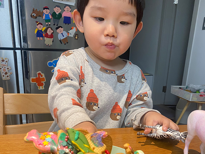 아이가 아이싱 쿠키 체험을 한 적이 없어 흥미가 없을까 걱정도 했지만, 다행히 다양한 모양의 쿠키와 물감처럼 생긴 아이싱에 관심을 보였습니다. 특히 아이가 좋아하는 말 모양 쿠키에는 다양한 색의 아이싱과 스프링클을 뿌려 정성스럽게 꾸며 주었습니다.
