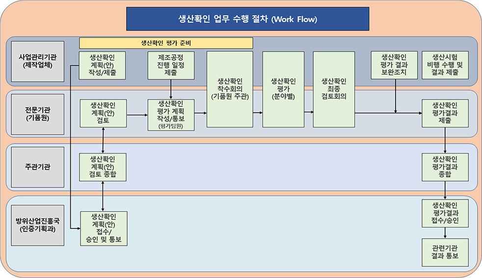 군용항공기 비행안전성 인증에 관한 업무규정(방위사업청 훈령)에 따라 생산확인은 군용항공기가 설계에 맞게 생산될 수 있는 기술, 설비, 인력 및 품질보증체계 등을 갖추고 있는지에 대한 확인(Validation)이다. 제작자가 생산확인 평가 기준을 충족함을 검증(Verification)하면, 기품원은 제출된 입증자료 등을 통해 제작업체가 승인된 설계에 맞게 생산 및 제작할 수 있는 능력(품질보증체계와 주요안전품목관리체계 등)을 갖추었는지를 확인하는 것을 목적으로 한다.