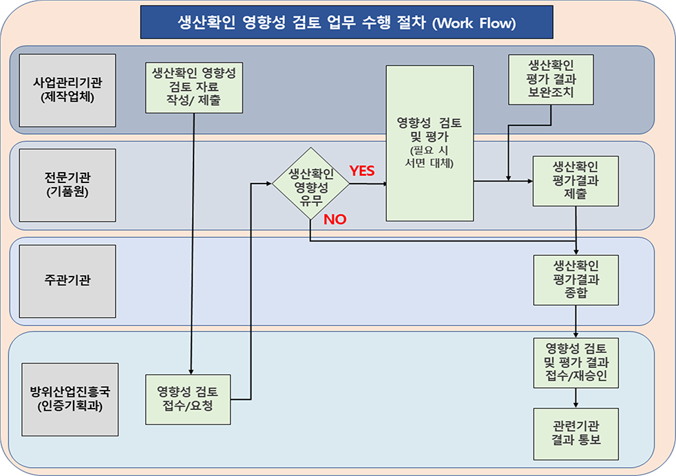 감항당국은 사업관리기관으로부터 접수된 생산확인 영향성 검토 요청을 기품원에 의뢰하며, 기품원은 이를 근거로 기승인된 내용 대비 변경사항 명확화 및 구체적 수행방안 등 추가자료를 요청할 수 있다. 기품원은 생산확인 요소변경에 따른 추가적인 영향성 평가가 필요하다고 판단되면, 평가를 수행하기 위해 생산확인 영향성 검토계획을 작성하여 제작업체에게 통보한다. 생산확인 영향성 검토계획에는 기존 대비 생산확인 요소의 변경사항과 그에 따라 영향을 미치는 평가기준 항목이 포함되어야 하며, 그 외 상세한 내용은 사업별 특성에 따라 추가할 수 있다.