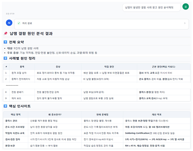 품질 결함 사례, 불량 원인, 유사 사례 등을 검색하고 분석합니다.
